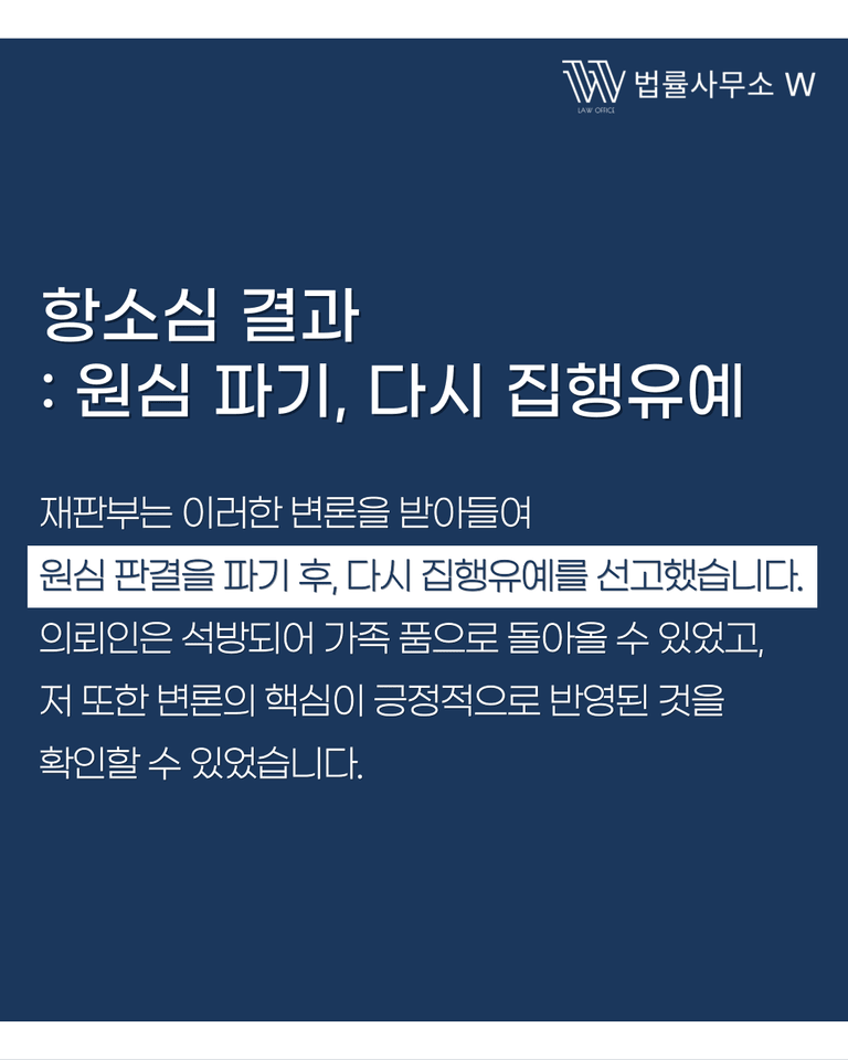 재판부는 이러한 변론을 받아들여 원심 판결을 파기하고 다시 집행유예를 선고했습니다. 의뢰인은 석방되어 가족 품으로 돌아올 수 있었고, 저 또한 변론의 핵심이 긍정적으로 반영된 것을 확인할 수 있었습니다.