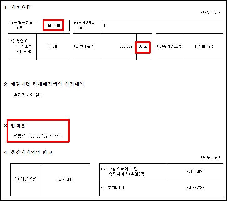👉 월 15만 원씩 36개월, 총 540만 원만 변제 → 전체 채무(약 1,661만 원)의 33.39%만 갚고 나머지 전액 탕감!