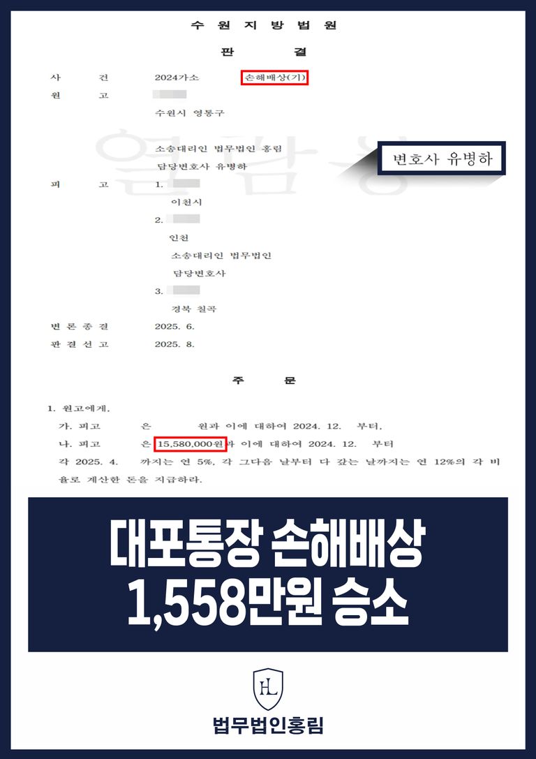 이들이 보이스피싱 범행에 가담했다고 판단하여 B씨 일당에게 손해배상 책임을 묻기로 결정했습니다. 이에 피해자 A씨는 법무법인 홍림의 변호인과 함께 대포통장 계좌주인 B씨 일당을 상대로 손해배상청구소송을 제기하게 되었습니다.