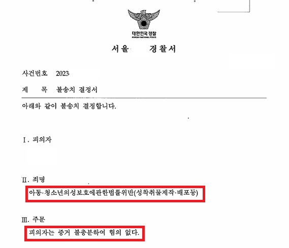결국, 경찰은 변호인의 이러한 의견을 받아들여 피의자가 전송한 사진이 아동·성착취물이라고 판단하기 어렵고 증명이 부족하다는 이유로 불송치(혐의없음-증거불충분)결정으로 사건을 종결하였습니다.