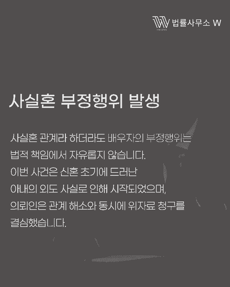 의뢰인은 부산에 거주하는 남성이었습니다. 아내와 결혼식을 마치고 사실혼 관계로 신혼을 이어가던 중, 아내가 다른 남성과 부정한 관계를 맺고 있다는 사실을 알게 되었습니다. 충격을 받은 의뢰인은 결국 사실혼 관계를 해소하고 부산이혼전문변호사를 찾아왔습니다.