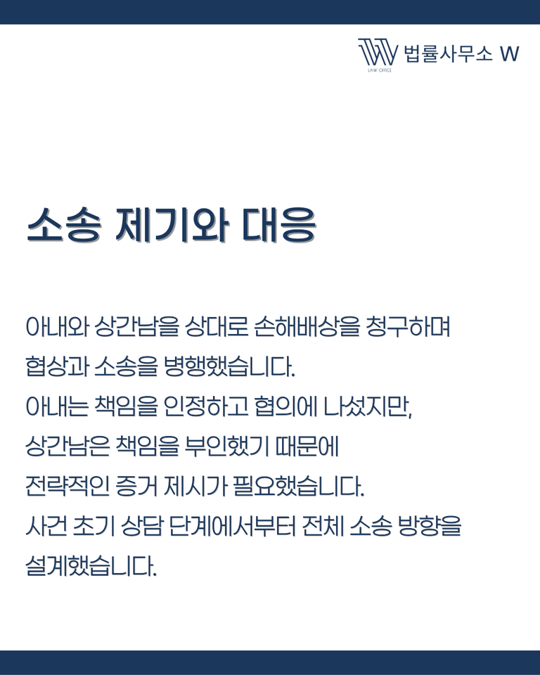 저는 아내와 상간남을 상대로 총 3,000만 원의 위자료를 청구했습니다. 아내는 책임을 인정하고 협의에 나섰지만, 상간남은 “혼인 사실을 몰랐다”라며 완강히 부인했습니다. 따라서 아내와는 조정을 통해 합의하고, 상간남과는 소송을 이어가며 혼인관계를 알 수밖에 없었다는 점을 집중적으로 입증했습니다.