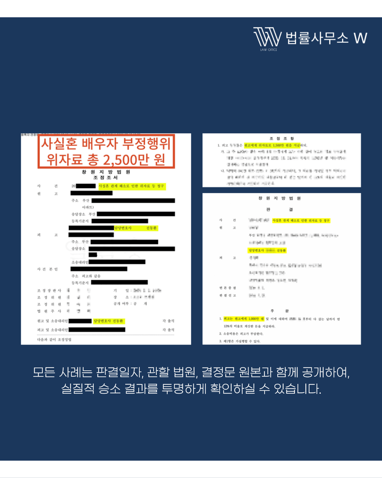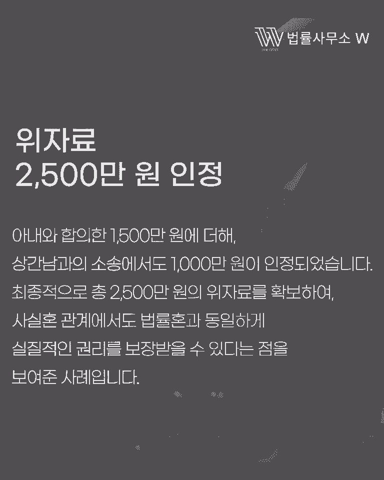 많은 분들이 “사실혼 관계라면 법률혼보다 불리한 것 아니냐”라는 질문을 하십니다. 그러나 사실혼 관계에서도 배우자의 부정행위가 입증된다면 위자료는 충분히 인정될 수 있습니다. 이번 사건에서는 총 2,500만 원의 위자료를 인정받을 수 있었습니다.