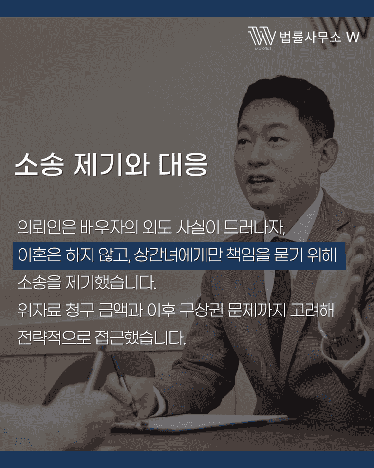 상간소송에서 중요한 것은 금액뿐 아니라 이후 구상 문제까지 종결하는 것입니다. 감정적인 대응에 그치지 않고, 구상권 문제까지 고려한 전략적 접근이 필요합니다.