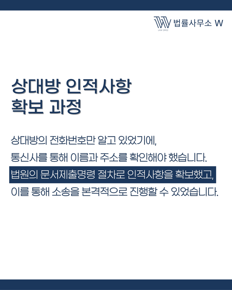당시 상대방에 대해 알고 있는 정보는 전화번호뿐이었습니다. 따라서 통신사를 통해 이름과 주소를 확인하는 절차가 필요했습니다. 일부 통신사는 바로 제공하지만, 경우에 따라 법원의 문서제출명령이 필요하기도 합니다. 적법한 절차를 거쳐 상대방의 인적사항을 확보한 후 본격적인 소송에 착수했습니다.