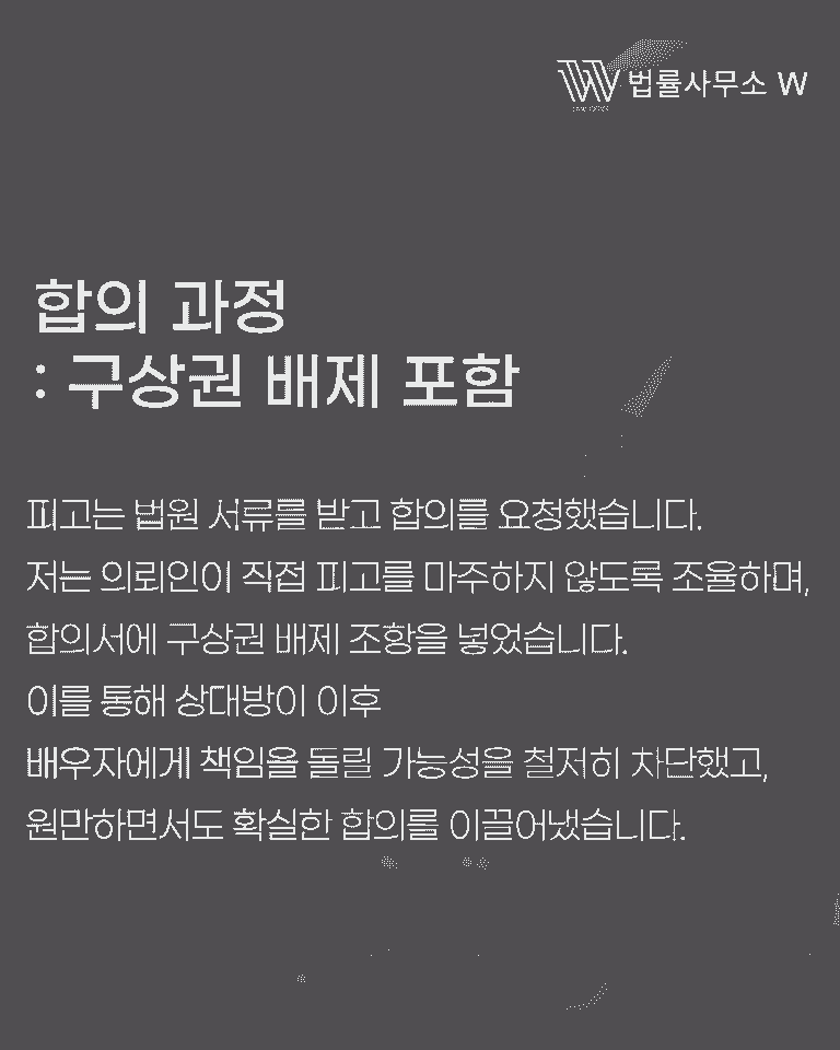 소송이 시작되자 피고는 사건의 심각성을 깨닫고 지인을 통해 합의 의사를 전달했습니다. 이에 저는 의뢰인이 직접 피고를 마주하지 않도록 조율하면서, 합의서에 구상권 배제 조항을 반드시 포함했습니다. 이는 상간녀가 추후 남편을 상대로 책임을 돌리는 시도를 원천적으로 차단하기 위한 조치였습니다.