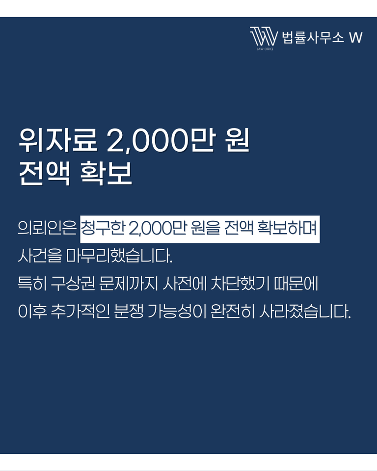 의뢰인은 위자료 2,000만 원을 청구한 그대로 전액 확보했습니다. 동시에 구상권 문제까지 차단하여 향후 분쟁 가능성을 없앴습니다. 이는 통상적인 사례와 비교해도 매우 유리한 결과로, 의뢰인의 만족도가 높았던 사건이었습니다.