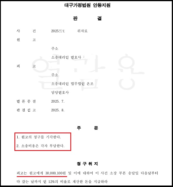 원고는 배우자와 이혼하면서 위자료로 2,000만원을 지급받은 사실이 확인됨사건결과