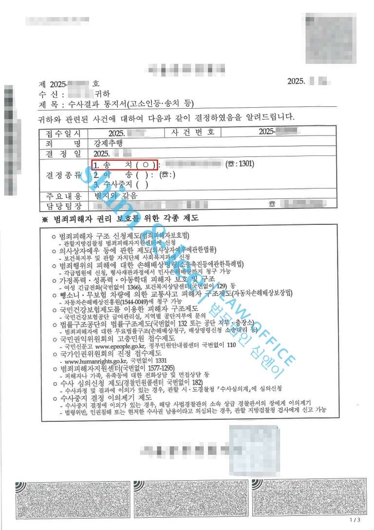 -결국 피해자의 의사에 반하여 강제적으로 신체 접촉을 한 사실이 인정되어 가해자는 강제추행 혐의로 송치되었습니다.