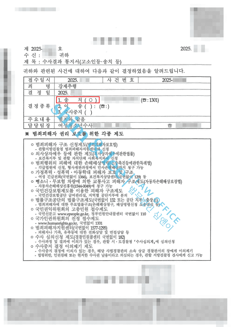 - 심앤이의 단호하고 철저한 대응으로 수사는 빠르게 진행되었고, 사건은 검찰로 송치되었습니다.