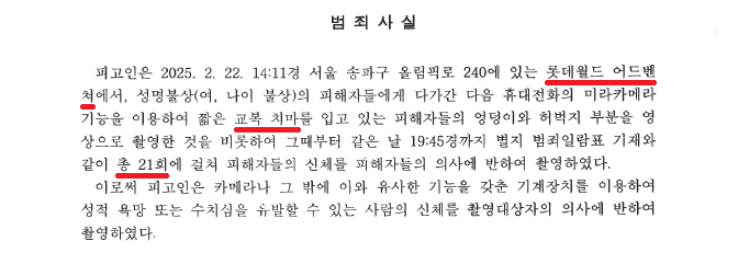 A씨는 2025. 2. 22.(토) 14:11경 롯데월드를 찾아 총 21회에 걸쳐 짧은 교복치마를 입고 있는 여성들을 몰래 동영상 촬영하다가 적발되어 현행범 체포되었습니다.