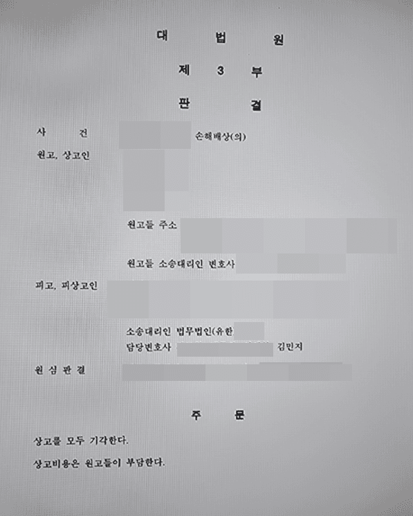 이에 불복한 원고들이 상고하였으나, 대법원 역시 심리불속행 기각으로 병원 측의 최종 승소가 확정되었습니다.