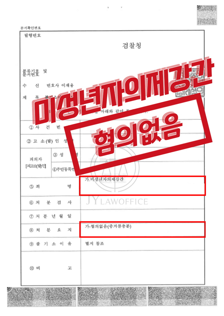이와 같은 본 변호인의 조력으로 미성년자의제강간 혐의에서 의뢰인은 혐의 없음의 처분을 받고 사건을 무사히 종결시킬 수 있었습니다.