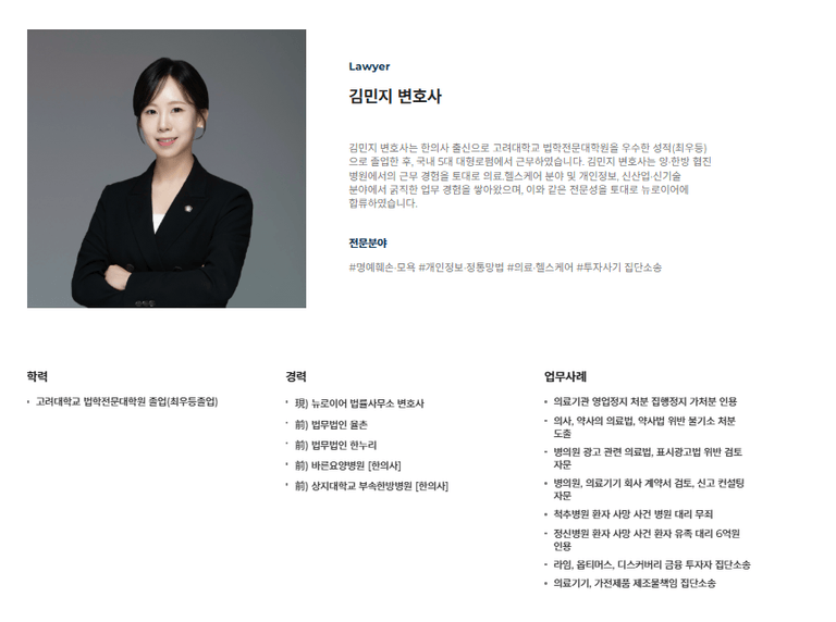 안녕하세요. 의료 현장의 특수성과 법적 쟁점을 함께 꿰뚫어보는 한의사 출신 , 김민지변호사입니다.