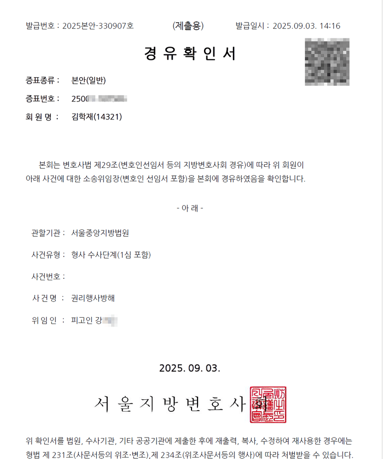 [의뢰현황] 2025년 9월 3일 강**님 권리행사방해 사건 위임