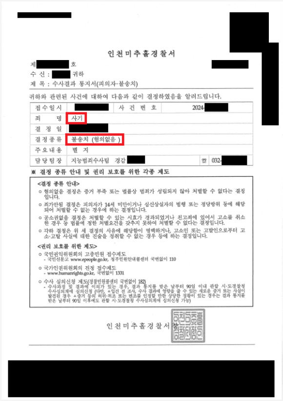 ![[불송치] 보이스피싱 상품권 교환 불송치결정](/_next/image?url=https%3A%2F%2Fd2ai3ajp99ywjy.cloudfront.net%2Fuploads%2Ftitleimage%2Foriginal%2F5d18de9e937e5c39b7e98841-original.jpg&w=3840&q=75)