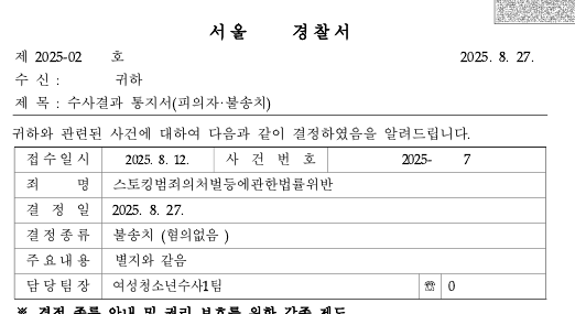 다행히도 스토킹처벌법에 해당하지 않는다는 판단을 받았습니다.