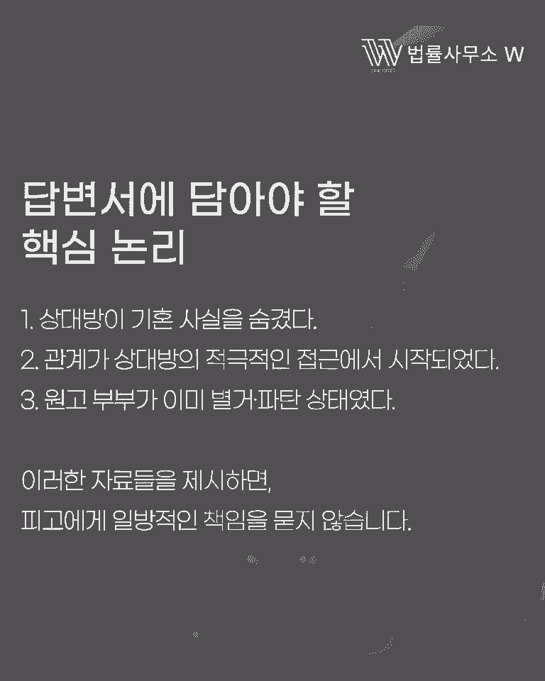 답변서에는 억울함이 아닌 증거와 논리가 담겨야 합니다. 상대방이 기혼 사실을 숨겼다는 점, 관계가 상대방의 적극적 접근으로 시작됐다는 점, 원고 부부가 이미 파탄 상태였음을 보여주는 자료가 핵심 논리입니다. 이런 주장을 뒷받침할 증거를 제시해야만 법원은 피고의 책임을 일방적으로 보지 않습니다.