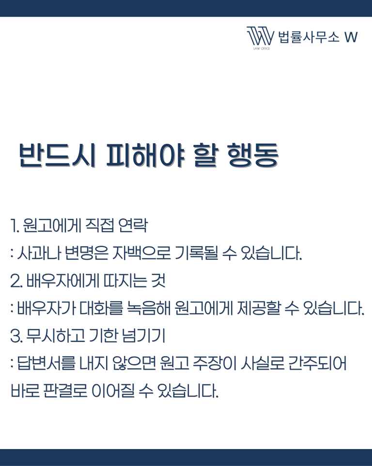 많은 분들이 법원에서 상간녀 소장을 받으면 막막한 마음부터 드십니다. 그러나 이때 가장 중요한 것은 감정적으로 대응하지 않는 것입니다. 원고에게 연락하거나, 답변서 제출 기한을 넘기면 사건은 걷잡을 수 없이 불리해집니다.
