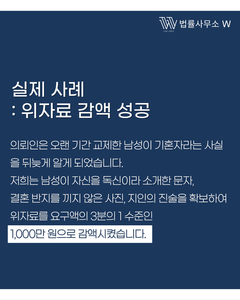 한 의뢰인은 교제 상대가 기혼자임을 숨겼다는 사실을 뒤늦게 알게 되었습니다. 소송에서 저희는 문자 메시지, 사진, 지인 진술을 확보했고, 원고 부부가 별거 중이었음을 입증했습니다. 결국 법원은 피고의 억울함을 인정했고, 위자료는 당초 요구액보다 크게 줄어든 1,000만 원으로 합의가 이루어졌습니다.