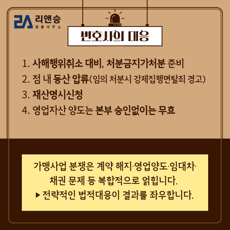 이번 사례는 가맹본부가 신속한 법적 조치로 협상을 주도하고, 원하는 결과를 이끌어낸 대표적인 사례라 할 수 있습니다.