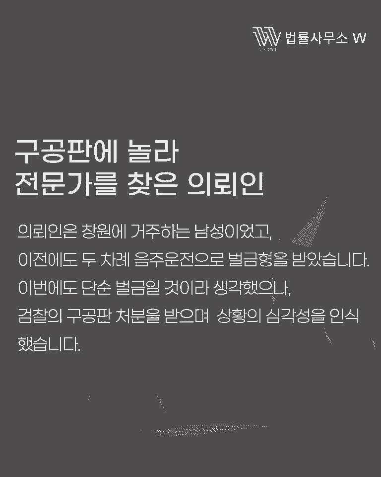 의뢰인은 과거 두 번의 음주운전 전력이 있었고, 이번 세 번째 적발로 구공판 처분을 받았습니다. 재판 준비 시간이 부족했으나, 변호인 선임을 통해 기일 연기를 이끌어냈습니다. 이후 반성문, 탄원서, 직장 자료 등 양형자료를 철저히 준비했습니다.