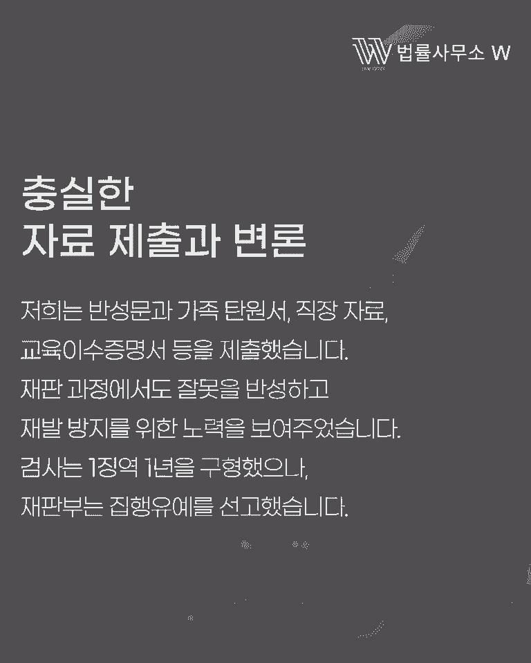 재판부는 저희 주장을 받아들여 실형 대신 집행유예를 선고했습니다. 다만 사회봉사와 교육 수강 명령이 병과되었는데, 이는 원래 실형에 해당하는 사건에서 마지막으로 선처한 결과였습니다.