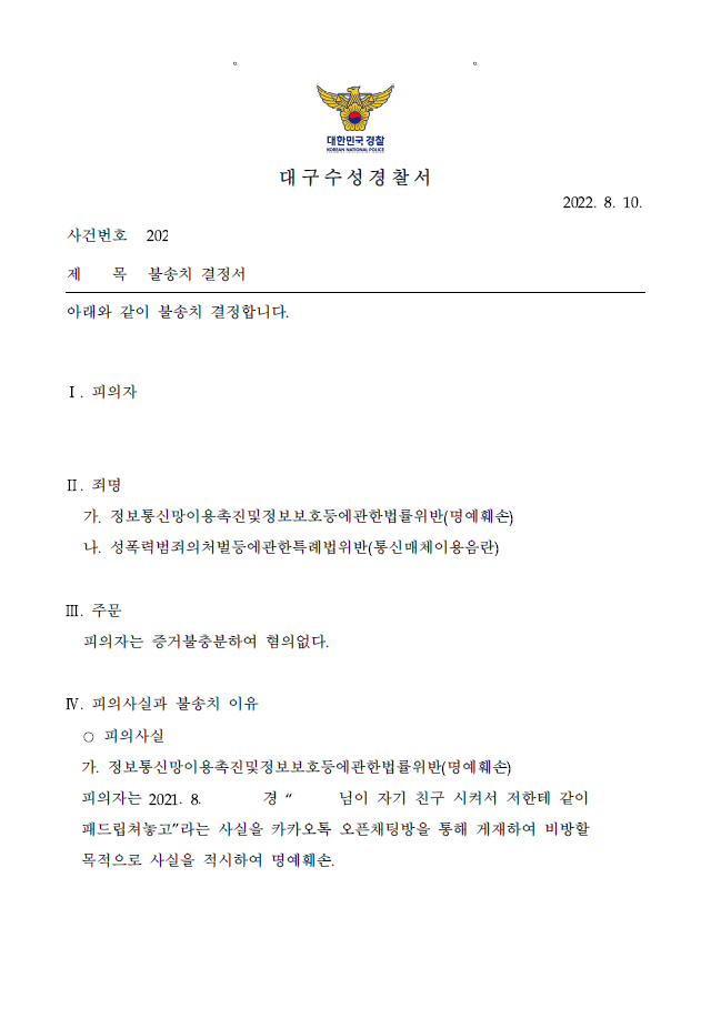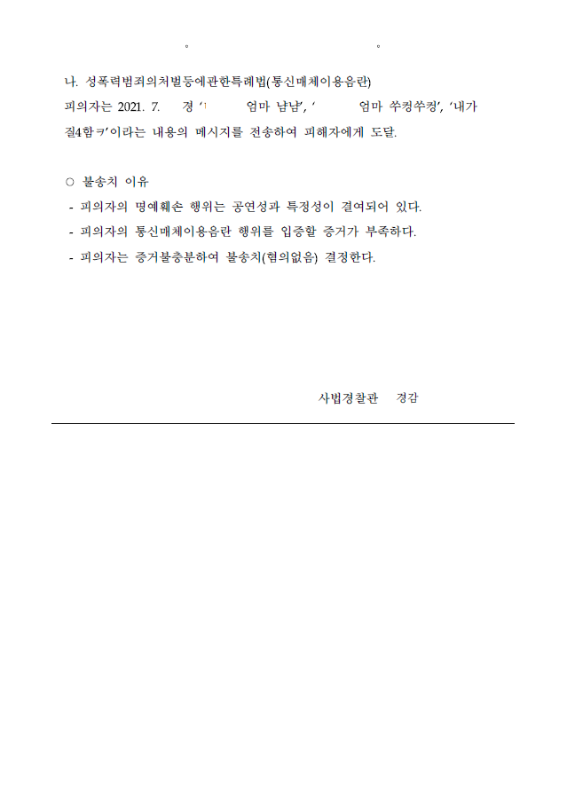 저의 주장은 전부 받아들여졌고, 경찰은 명예훼손, 통신매체이용음란죄(통매음)에 대해서 전부 불송치 결정을 하였습니다. 의뢰인은 나이 어린 대학생이었는데, 모든 근심 걱정을 떨치고 무사히 평상시 생활로 복귀할 수 있었습니다. 수많은 형사사건을 진행하였지만, 항상 최선을 다했고, 그 과정에서 수많은 어려움을 극복해 낼 수 있었습니다. 본건도 매우 어려운 사건이었지만, 매우 좋은 결과가 나와서 너무나도 기뻣습니다. 저의 효과적인 변론으로 인하여 의뢰인은 일상으로 돌아갔고, 저 또한 큰 보람을 느낄 수 있었습니다.