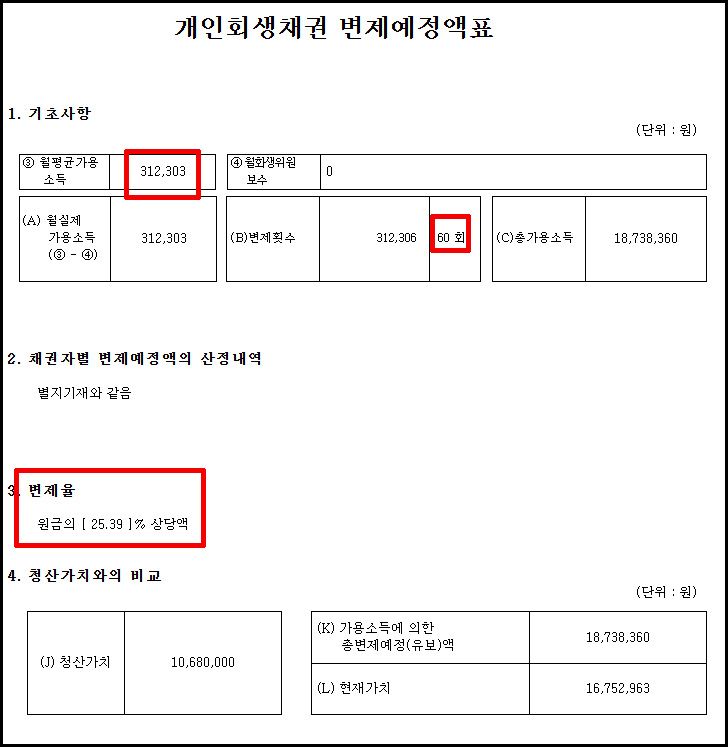총 채무 약 7,500만 원 중, 월 31만 원 × 60개월 = 약 1,860만 원(25.39%)만 변제하고 나머지는 전액 면책을 받게 되었습니다.