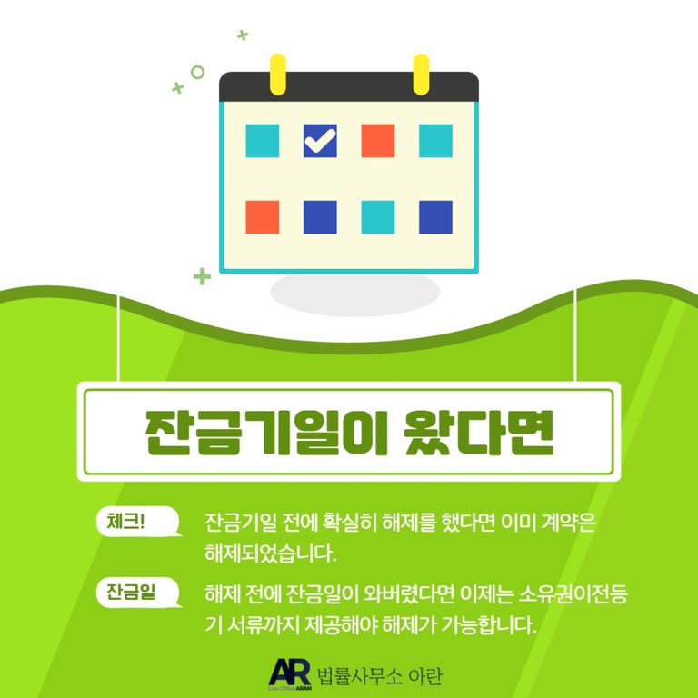 잔금지급기일이 다가오기 전에 계약을 해제하지 못하면, 해제통보를 하는 것만으로는 계약을 해제할 수 없습니다.