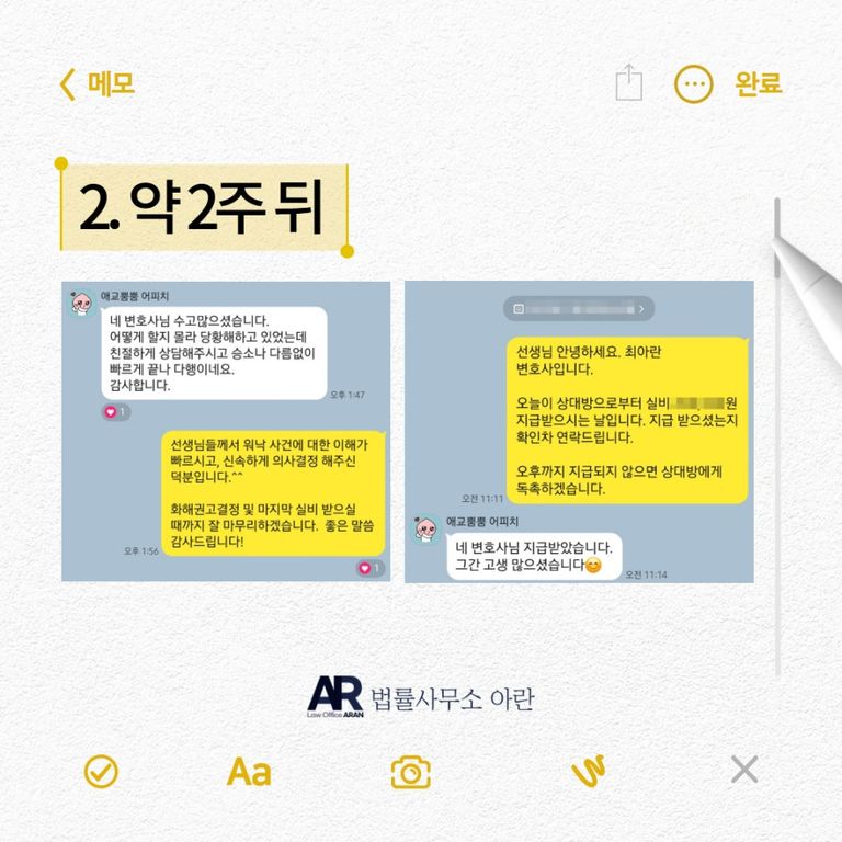 이후 법률사무소 아란에서는 상대방과 손해배상금액 외에 추가로 소송을 위해 지출한 실비 지급에 대해 합의하였습니다.