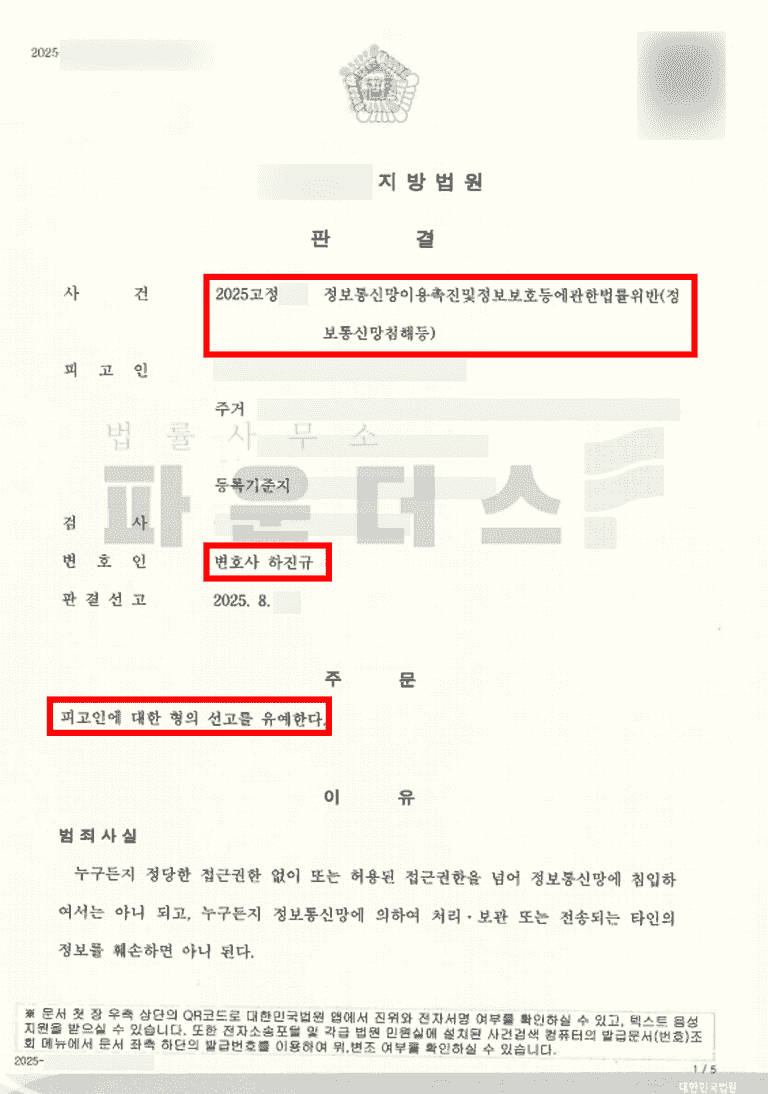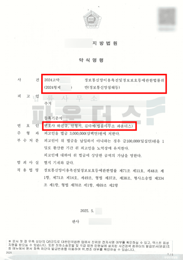 이 같은 내용으로 의뢰인은 정통망침해 혐의에서 약식 300만원 처분을 받게 되었고 이후 정식재판청구를 진행하고자 변호인의 조력을 요청하였습니다.
