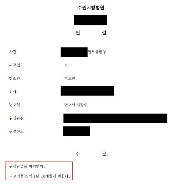 또한 이와 같이 일부 부분이 무죄로 인정되었기에 항소심에서는 판결을 다시 선고하며 피고인에 대하여 2개월이 감경된 1년 10개월형을 선고하였습니다.