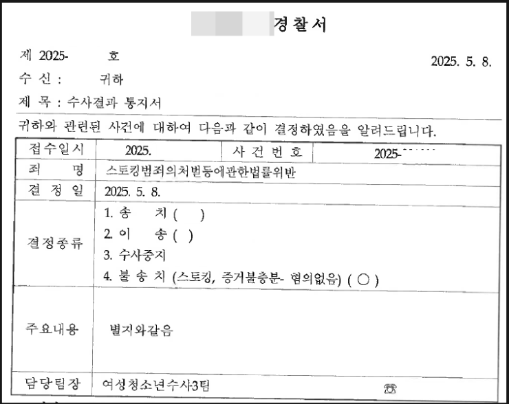 경찰 수사단계에서 "불송치" 결정으로 종결되었습니다.