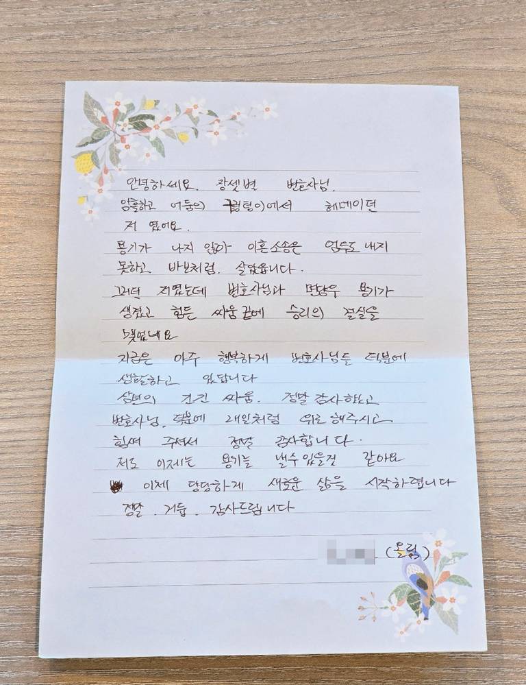지금은 아주 행복하게 변호사님들 덕분에 생활하고 있답니다.