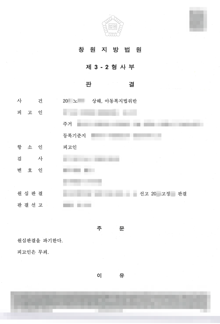 이처럼 법률사무소 제일로의 치밀한 조력 덕분에 항소심 재판부는 1심 판결에 영향을 미친 위법이 있다고 판단했습니다. 검사가 제출한 증거만으로는 의뢰인이 아이를 때렸다고 인정하기 부족하다고 보았으며, 1심 판결을 파기하고 '무죄'를 선고했습니다.