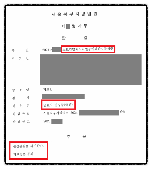 1심에서 스토킹 유죄 판결을 받고 절망에 빠졌던 의뢰인께서 항소심에서 무죄를 선고받은 후 보내주신 메시지입니다. 포기하지 않고 진실을 밝히기 위해 노력한 끝에, 법원이 저희의 주장을 인정해 준 값진 성공 사례를 소개합니다.
