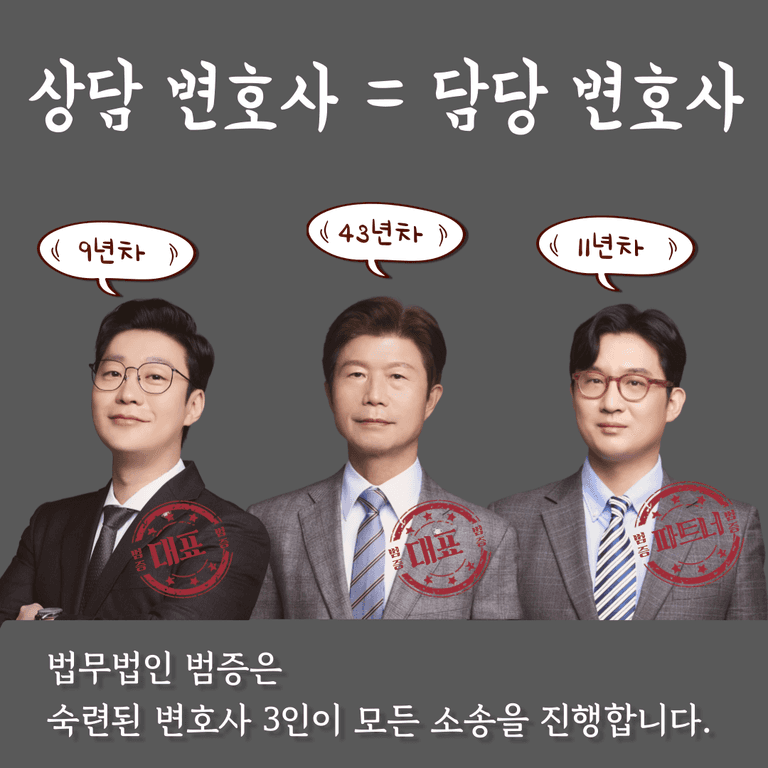 # 아무리 소액의 사건이라도 '무조건' 서울북부지방법원 수석부장판사 경력 대표변호사, 서울대 법대 출신 파트너 변호사와 함께 '3인이 협업'하여 사건을 진행합니다.
