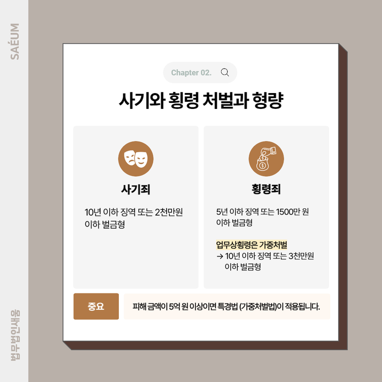 또한 두 범죄 모두 피해 금액이 5억 원 이상일 경우 특정경제범죄 가중처벌법이 적용됩니다. 이득액이 5억 원 이상 50억 원 미만이라면 3년 이상의 유기징역, 50억 원 이상이라면 5년 이상의 유기징역 또는 무기징역에 처해질 수 있습니다.