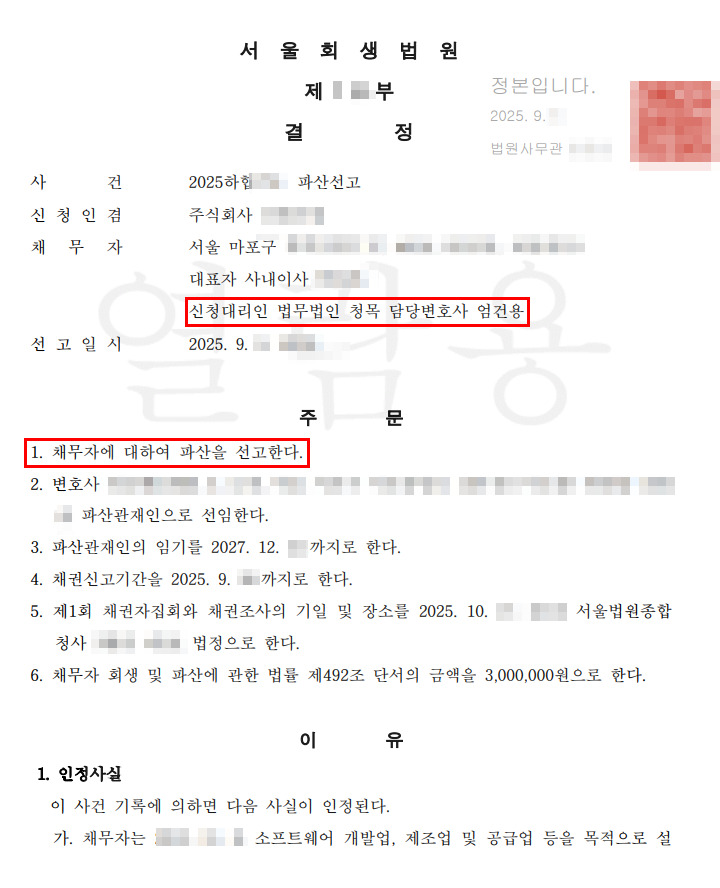 대출 약 4억원을 정리하기 위해 법인파산 신청을 하였고, 대표자 심문을 거쳐 파산선고를 받아내는데 성공하였다.