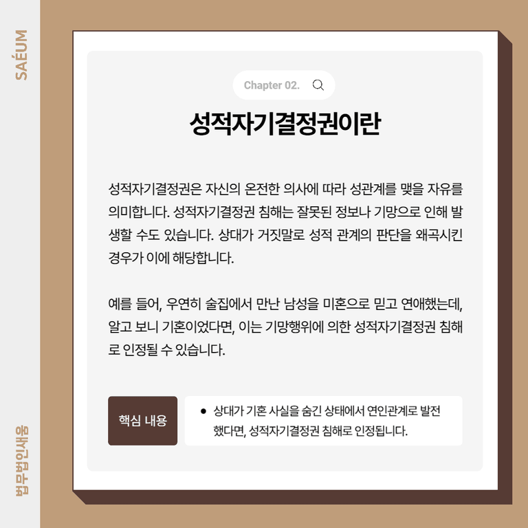 또한 성적자기결정권의 침해는 잘못된 정보나 기망으로 인해 발생할 수도 있습니다. 상대가 거짓말로 성적 관계의 판단을 왜곡시킨 경우가 이에 해당합니다. 예를 들어, 우연히 술집에서 만난 남성을 미혼으로 믿고 연애했는데, 알고 보니 기혼이었다면, 이는 기망행위에 의한 성적자기결정권 침해로 인정될 수 있습니다.