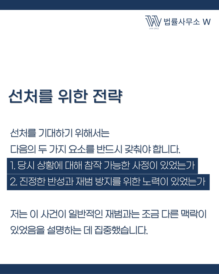 의뢰인은 저의 조언을 따라 각종 양형자료를 정리해 주셨고, 저는 해당 자료와 사건 당시의 구체적인 경위를 중심으로 변론을 준비했습니다. 특히 단순히 “한 번만 봐달라”는 식의 주장이 아니라, 이 사건이 일반적인 재범과는 조금 다른 맥락이 있었음을 설명하는 데 집중했습니다.