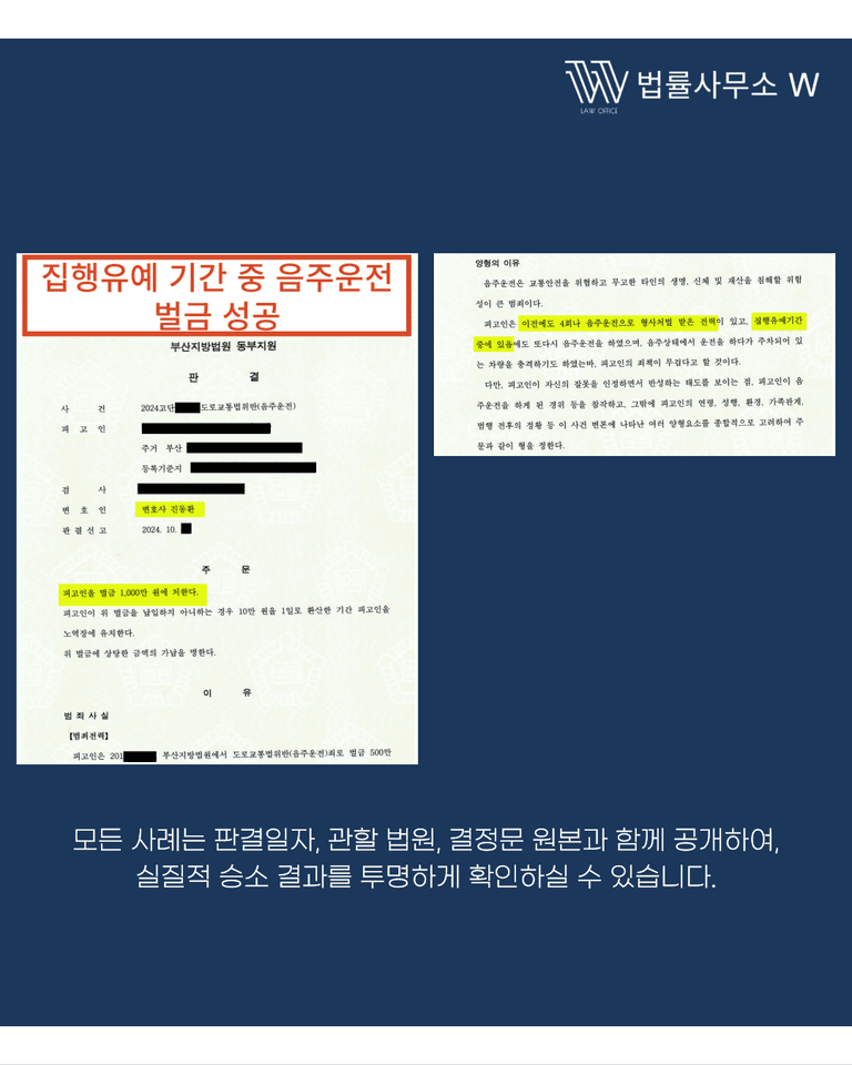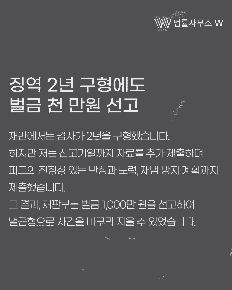 결국 재판부는 피고인의 반성과 개선 의지를 받아들였고, 벌금 1,000만 원이라는 선처를 내려주셨습니다. 집행유예 기간 중 실형이 아닌 벌금형으로 사건을 마무리 지은 것입니다.