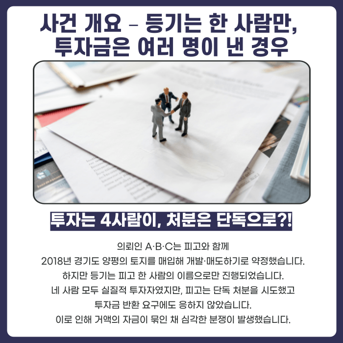 실제 투자자는 네 명이었지만, 피고는 혼자 소유자인 것처럼 행동하며 처분을 시도했고, 투자금 반환 요구에도 응하지 않았습니다. 결국 거액의 자금이 묶이며 분쟁으로 이어졌습니다.