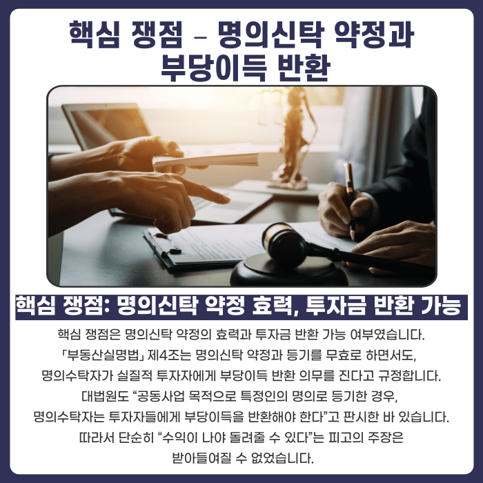 쟁점은 “명의신탁 약정이 무효인 상황에서도 투자금을 돌려받을 수 있는가”였습니다.