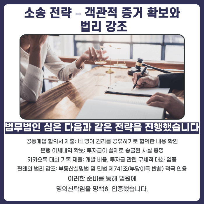 법무법인 심은 명의신탁과 투자금 반환 소송 경험을 바탕으로 의뢰인에게 최적의 전략을 제공합니다. 비슷한 문제로 고민 중이라면 전문가와 상담하시길 권합니다.