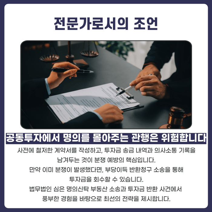 부동산 공동투자에서 특정인 명의로만 등기하는 것은 큰 위험을 초래합니다. 반드시 계약서를 명확히 작성하고, 송금 내역과 대화 기록을 남겨두어야 안전합니다.