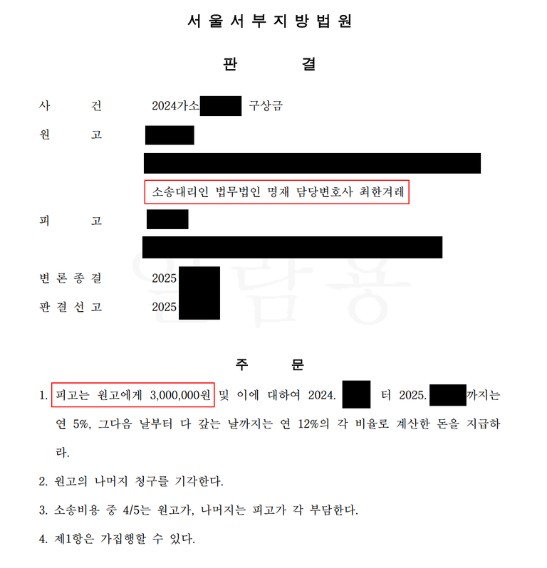 영희는 강제조정에서 구상금 청구를 취하하라고 나왔을 때만해도 이의를 하더라도 판결에서도 강제조정처럼 결과가 나오지 않을까 걱정했는데 다행히 철수에게 구상금 청구가 일부 인정되어 만족한다고 합니다.