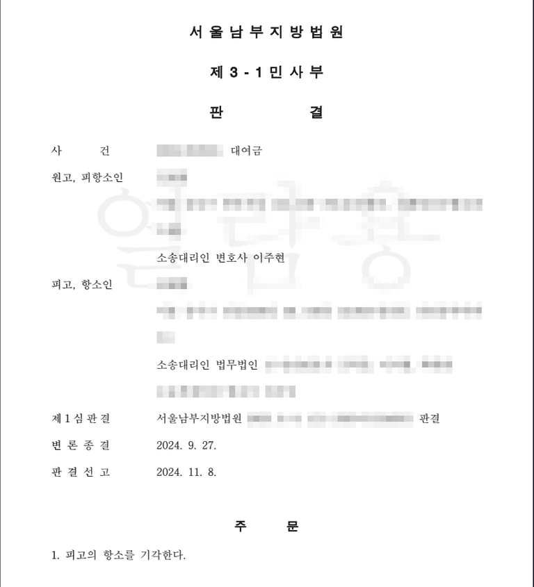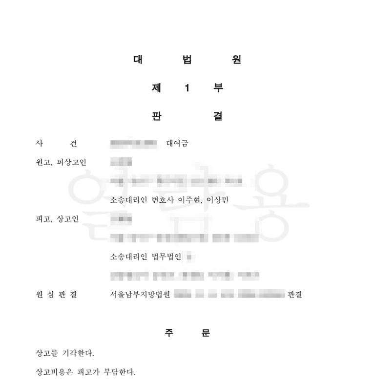 이에 저는 1심 판결문이 존재하였기에 항소심에서의 다툼에 앞서 우선 전 남친 소유의 부동산 조회를 통하여 부동산 강제경매를 진행하며 전 남친을 압박하였고, 소송에 있어서도 결국 의뢰인의 승소를 이끌었습니다. 이에 전 남친은 대법원의 상고까지 하였고, 그 사이 제 의뢰인은 기존에 진행된 부동산 강제 경매에 있어서 일부 배당을 받았고, 그 사이 전 남자친구의 타 재산(보유계좌, 거주지에 대한 임대차보증금 압류 등) 등을 찾아 또 다시 압박을 하며 위 대법원 사건에 집중하였고, 결국 제 의뢰인의 승소로 재판을 마무리하였습니다.