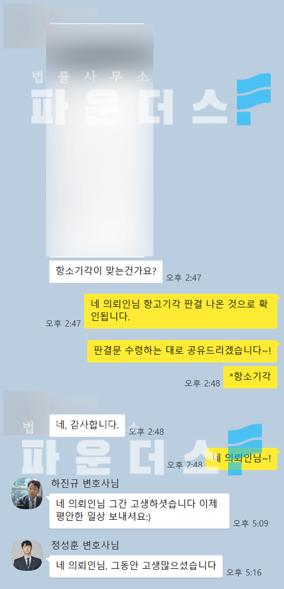 무죄 판결 후 검사 측은 의뢰인이 피해자의 의사에 반해 메시지를 전송했다며 사실오인 및 채증법칙 위반을 주장하며 항소를 제기하였고 항소심 재판을 앞두게 된 의뢰인은 변호인의 조력을 요청하였습니다.